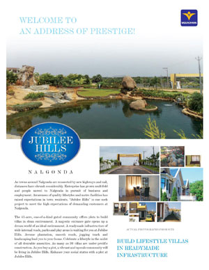 Celebrate a lifestyle of elite kind. A grand new world of lifestyle opens as “Jubilee Hills”, an exclusive gated community of villas at Nalgonda. Designed and built for happy living in freedom, Jubilee Hills is benchmarked to Metro standards and offers literally an elevating lifestyle with vast open spaces, amenities and total security for discerning customers.